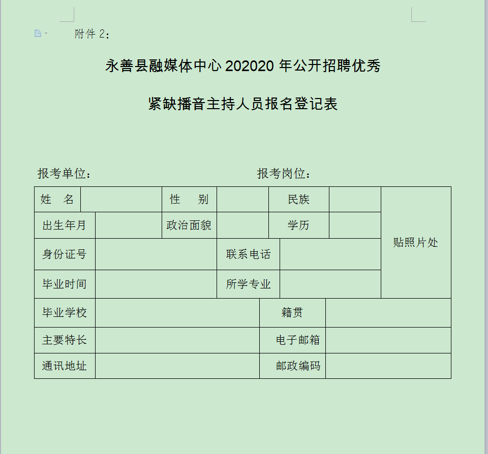 2.昭通市永善縣事業(yè)單位2020年公開招聘優(yōu)秀緊缺專業(yè)技術(shù)人才報名登記表
