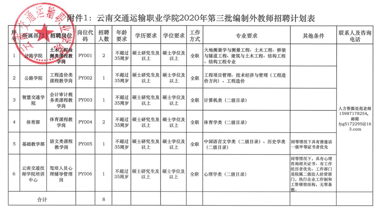 招聘崗位、專業(yè)及相關(guān)要求詳見《云南交通運(yùn)輸職業(yè)學(xué)院2020年編制外教師招聘計(jì)劃表》(附件1)。報(bào)名時(shí)間:2020年5月12日至5月20日。