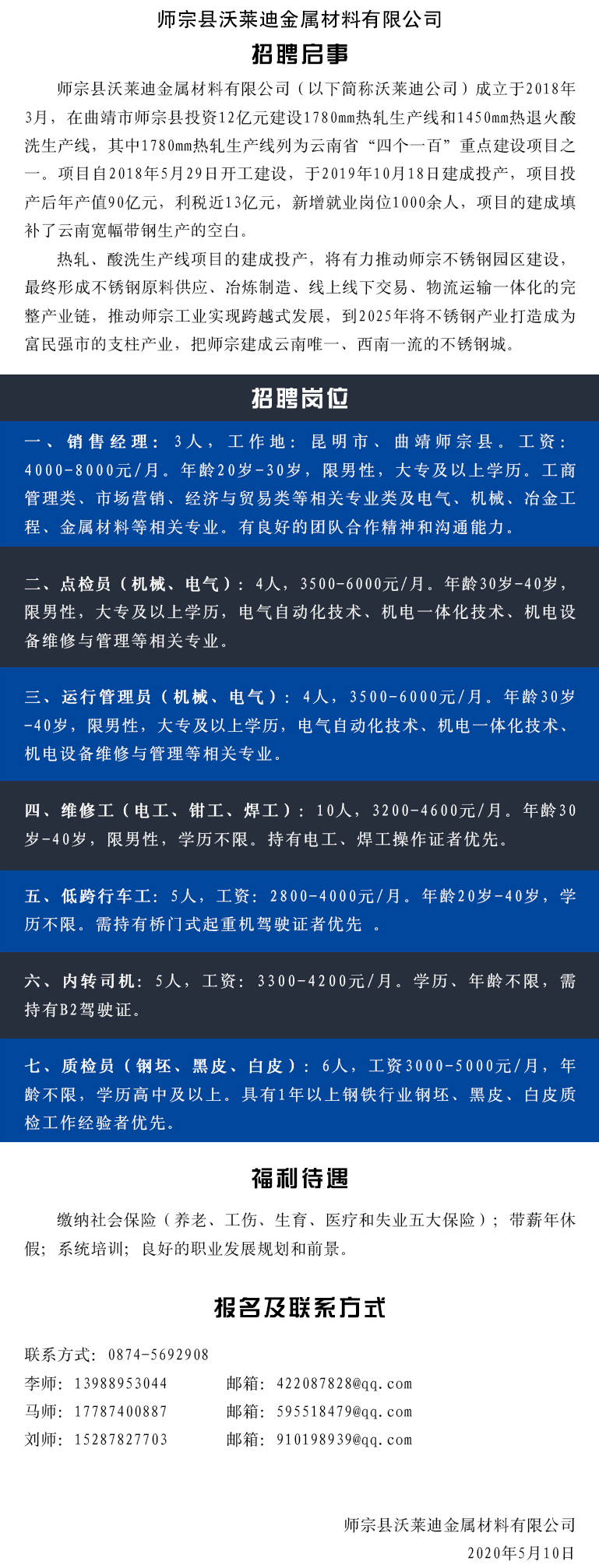 2020年師宗縣沃萊迪金屬材料有限公司招聘啟事