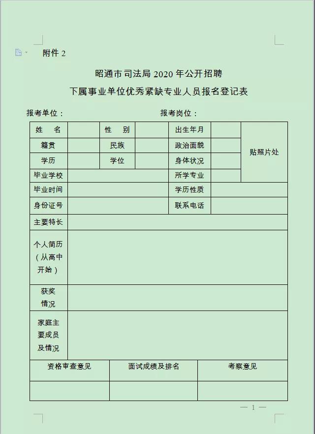2. 昭通市司法局2020年公開招聘下屬事業(yè)單位優(yōu)秀緊缺專業(yè)人員報名登記表