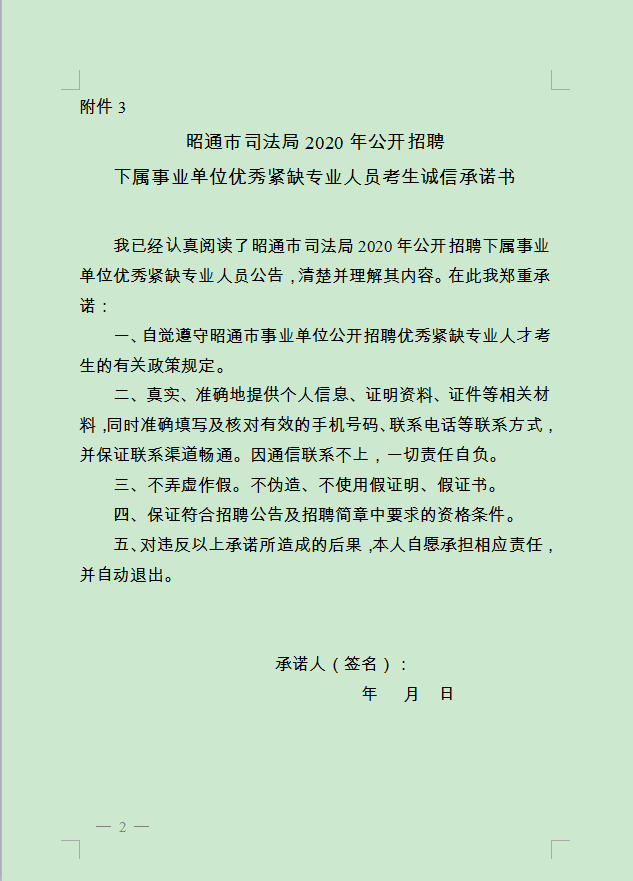 3. 昭通市司法局2020年公開招聘下屬事業(yè)單位優(yōu)秀緊缺專業(yè)人員考生誠信承諾書