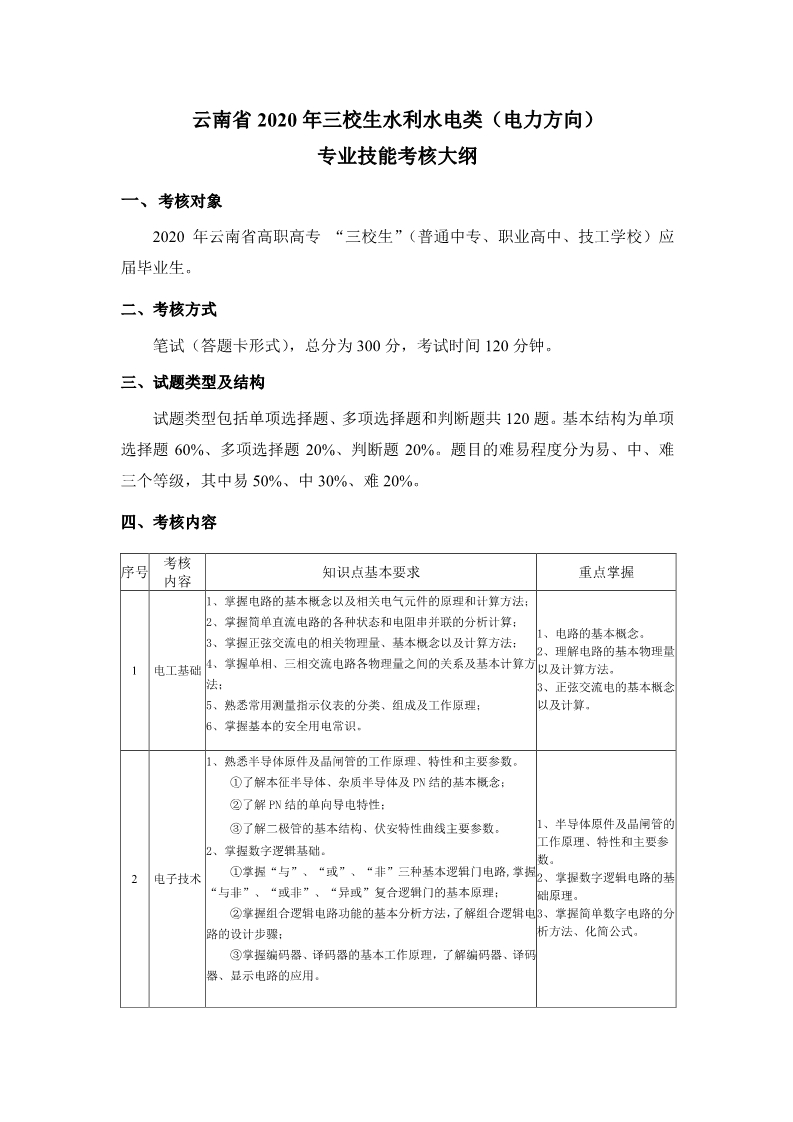 云南省2020年三校生-水利水電類(電力方向)技能考核大綱