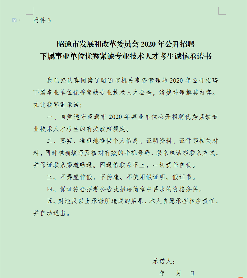 3. 昭通市發(fā)展和改革委員會(huì)2020年公開招聘下屬事業(yè)單位優(yōu)秀緊缺專業(yè)技術(shù)人才考生誠信承諾書