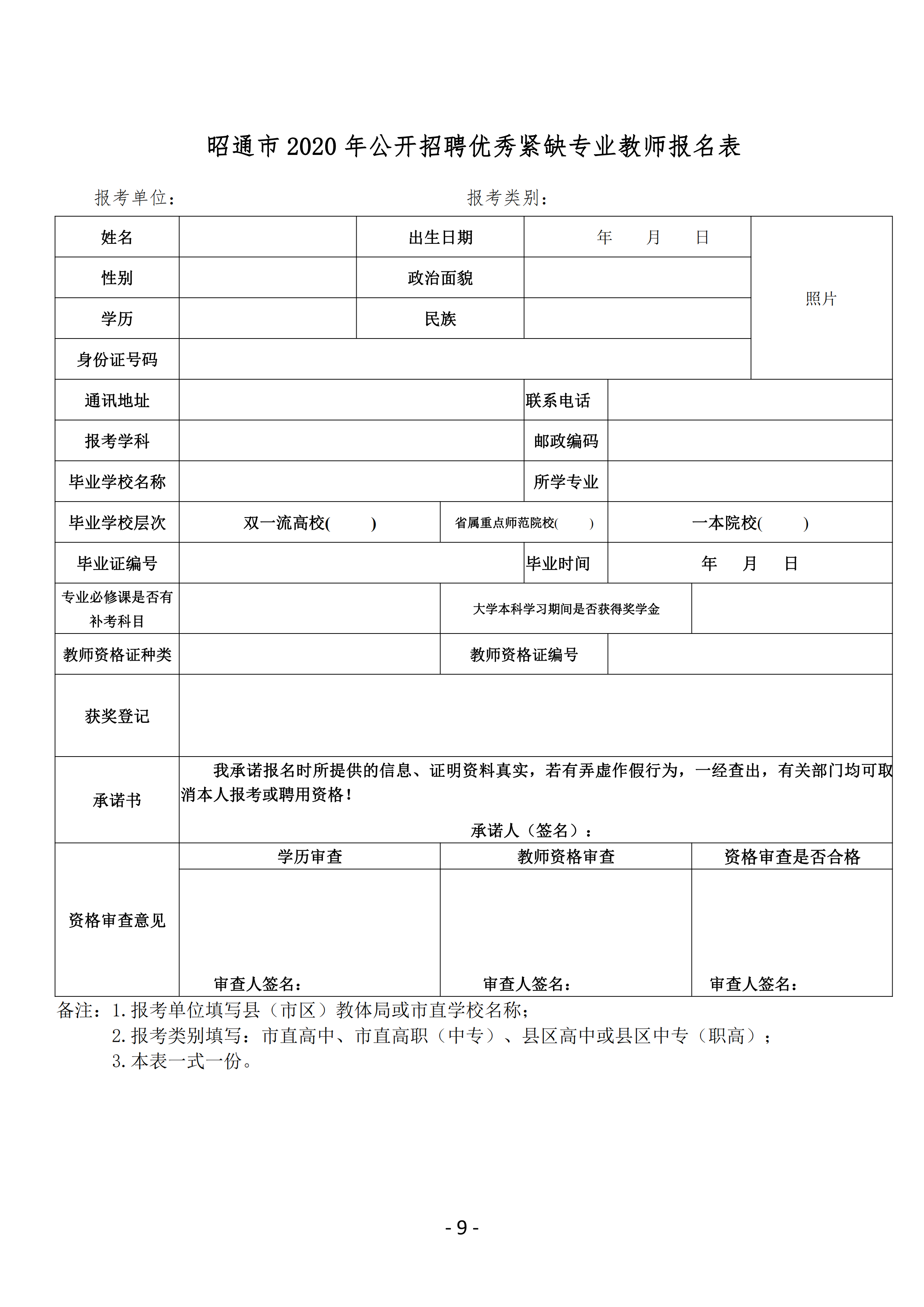 1.報名所需材料:《昭通市2020年公開招聘優(yōu)秀緊缺專業(yè)教師報名表》(附件3)、畢業(yè)證或《大中專畢業(yè)生就業(yè)推薦表》、學(xué)位證、畢業(yè)學(xué)校蓋章的《成績登記表》、身份證、獲獎證書的原件及一式一份復(fù)印件、電子照片、獲得獎學(xué)金的證明材料。