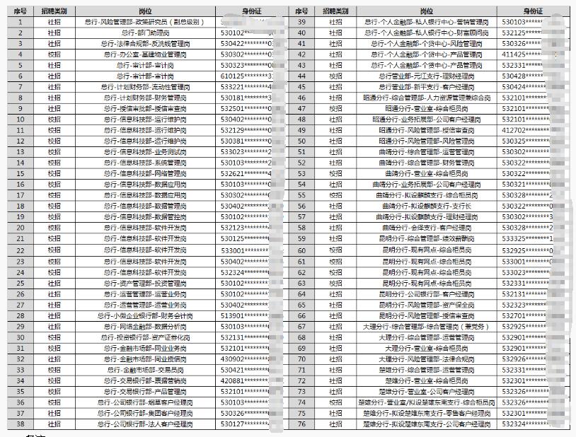 云南紅塔銀行2020年社會招聘暨校園招聘入圍人員公告
