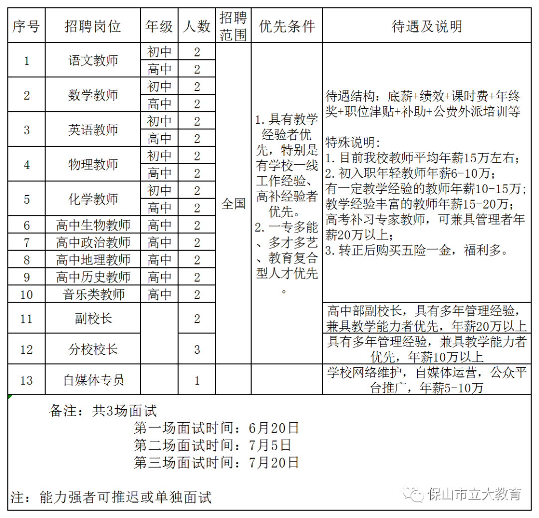 保山市立大高補(bǔ)學(xué)校主要以高考補(bǔ)習(xí)班、藝考班、初高三全日制沖刺班為主、周末假期班為輔,涉及學(xué)生群體主要面臨中高考,對(duì)招聘教師要求較為嚴(yán)格,薪水待遇高于行業(yè)平均水平,福利較多,轉(zhuǎn)正后將購買五險(xiǎn)一金。