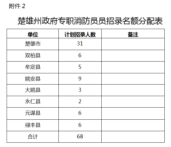 2.楚雄州政府專職消防員招錄名額分配表