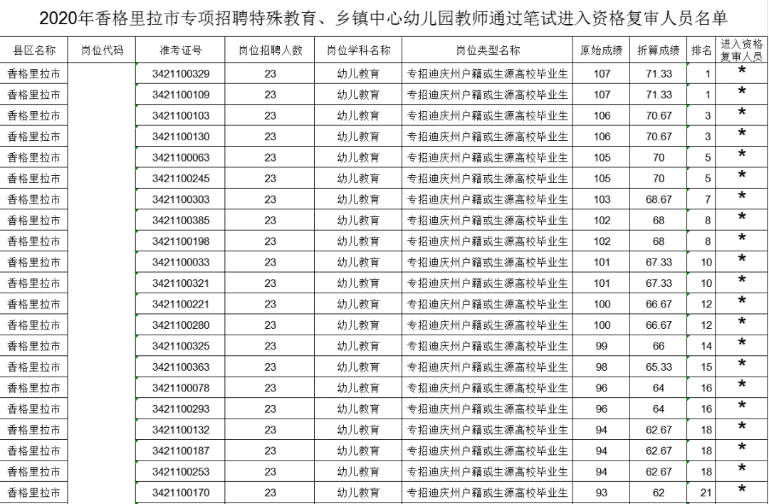 我市將于2020年6月18日(上午9:00—12:00,下午2:30—5:30)在香格里拉市人力資源和社會保障局三樓進行2020年香格里拉市專項招聘特殊教育、鄉(xiāng)鎮(zhèn)中心幼兒園教師崗位資格復審。報考免筆試崗位的考生請按公告按時參加資格復審。特殊教育崗位不設開考比例,招聘人數與報名人數比例達不到1:2,筆試成績合格分數線劃定為折后分數45分。現(xiàn)將通過筆試進入資格復審人員公告如下,“ * ”為進入資格復審人員,請按時參加。