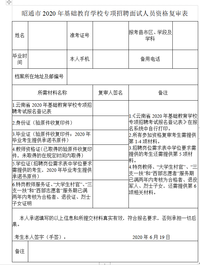 1.云南省2020年基礎(chǔ)教育學校專項招聘考試報名登記表;