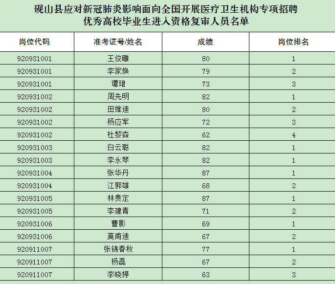 附件:硯山縣應(yīng)對新冠肺炎影響面向全國開展醫(yī)療衛(wèi)生機(jī)構(gòu)專項(xiàng)招聘優(yōu)秀高校畢業(yè)生進(jìn)入資格復(fù)審人員名單