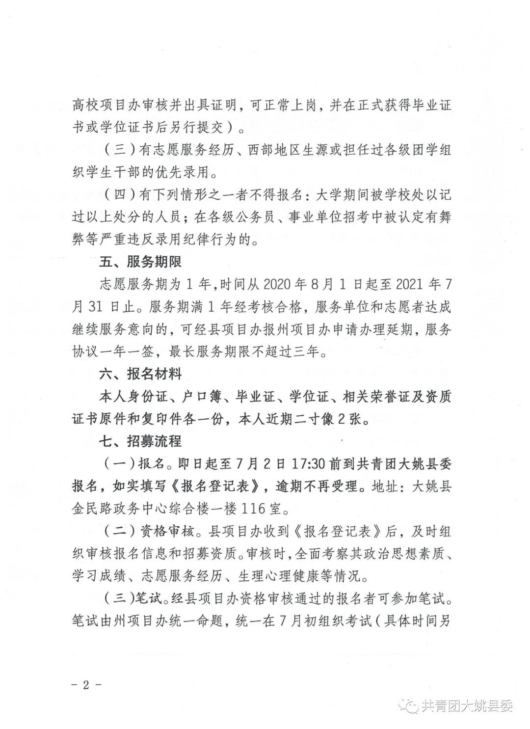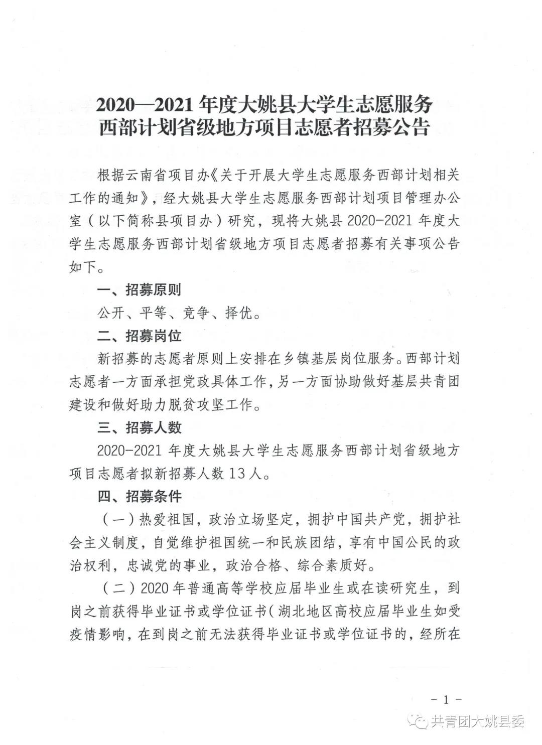 2020—2021年度大姚縣大學生志愿服務(wù) 西部計劃省級地方項目志愿者招募公告