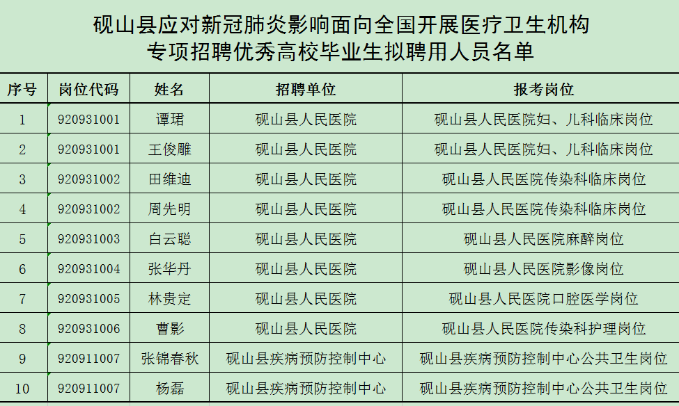 根據(jù)《云南省應對新冠肺炎影響大幅增加名額面向全國開展基礎(chǔ)教育學校和醫(yī)療衛(wèi)生機構(gòu)專項招聘優(yōu)秀高校畢業(yè)生工作方案》《文山州應對新冠肺炎影響面向全國開展醫(yī)療衛(wèi)生機構(gòu)專項招聘優(yōu)秀高校畢業(yè)生通告》精神,2020年硯山縣衛(wèi)生事業(yè)單位計劃專項招聘優(yōu)秀高校畢業(yè)生10人,經(jīng)過網(wǎng)上報名、網(wǎng)上審核、人機對話考試、現(xiàn)場審核、面試、考察、體檢等程序,共有10位同志符合擬聘用條件。為進一步做好后續(xù)聘用相關(guān)工作,現(xiàn)對10位擬聘用人員進行公示: