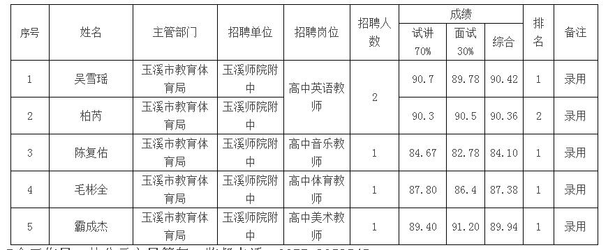 玉溪師院附中2020年提前招聘教師5名,按玉溪市事業(yè)單位提前招聘工作要求,經(jīng)過報名、資格審查、試講、面試、體檢、考察合格,現(xiàn)將擬聘用人員名單公示如下。