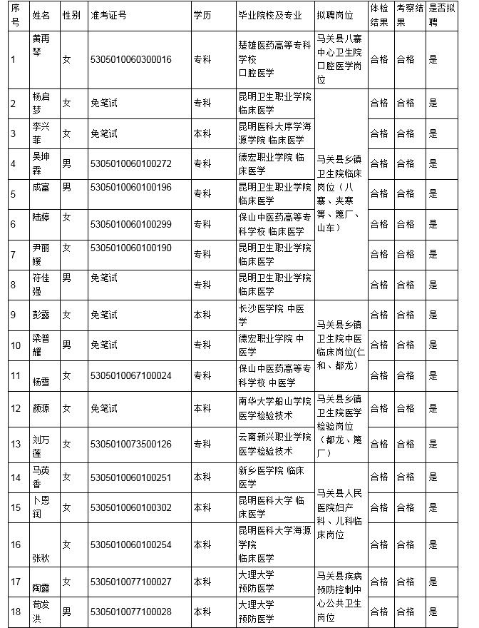 根據(jù)《文山州應(yīng)對新冠肺炎影響面向全國開展醫(yī)療衛(wèi)生機(jī)構(gòu)專項(xiàng)招聘優(yōu)秀高校畢業(yè)生通告》的規(guī)定,現(xiàn)將2020年馬關(guān)縣應(yīng)對新冠肺炎影響面向全國開展醫(yī)療衛(wèi)生機(jī)構(gòu)專項(xiàng)招聘體檢結(jié)果、考核結(jié)果及擬聘用人員名單公示如下,公示期為7天(2020年7月3日-7月10日)。公示期內(nèi),若對擬聘用人員有異議的,請攜帶本人身份證和投訴舉報(bào)書面材料向中共馬關(guān)縣紀(jì)委監(jiān)委派駐馬關(guān)縣衛(wèi)生健康局紀(jì)檢組(電話:0876-7125561)進(jìn)行現(xiàn)場實(shí)名制舉報(bào)(不受理電話舉報(bào)和網(wǎng)絡(luò)舉報(bào)),逾期不予受理。對被舉報(bào)人員進(jìn)行復(fù)核不符合條件和資格的,取消聘用資格。