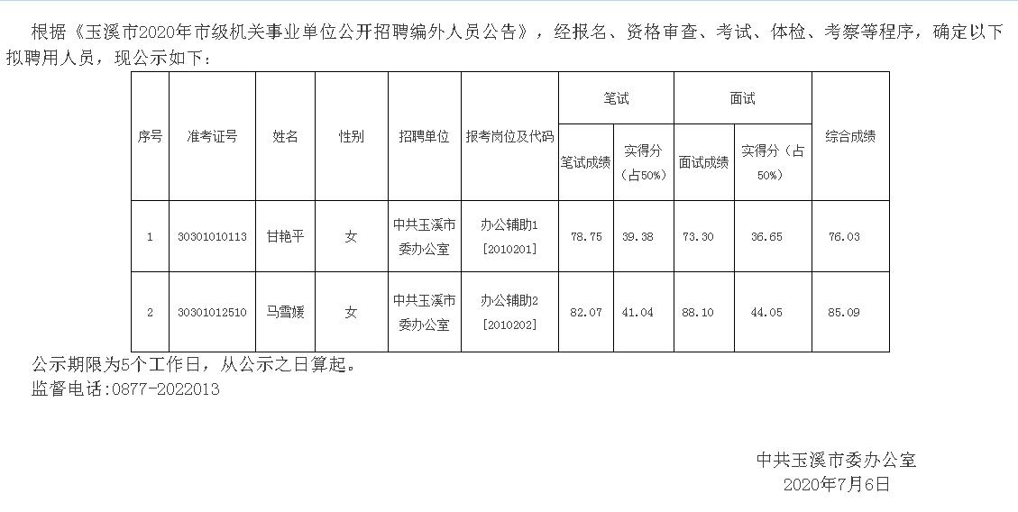 中共玉溪市委辦公室2020年公開招聘編外人員擬聘用人員公示
