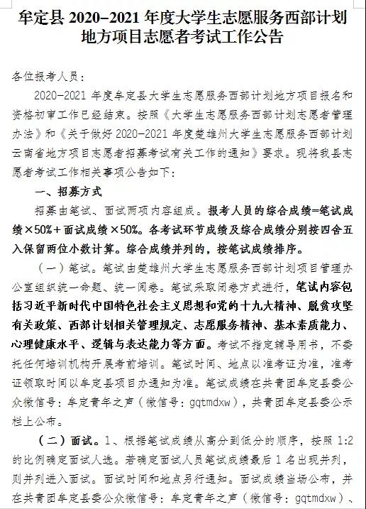 3.其他考試相關(guān)事宜詳見《牟定縣2020-2021年度大學(xué)生志愿服務(wù)西部計劃地方項目志愿者考試工作公告》。