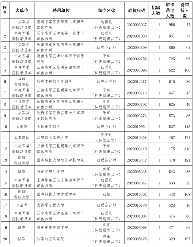 2020年全軍面向社會公開招考文職人員(不含博士崗位)網(wǎng)上報(bào)名還剩2天時(shí)間,截至2020年7月8日17時(shí),有257045名報(bào)考人員通過網(wǎng)上報(bào)名資格初審,69453名報(bào)考人員正在審核。19934個(gè)崗位有考生報(bào)考、占81.3%,平均報(bào)招考比為13.3∶1,最高報(bào)招考比為1003∶1,有4582個(gè)崗位暫時(shí)無人報(bào)考。網(wǎng)上報(bào)名系統(tǒng)將于7月10日18時(shí)準(zhǔn)時(shí)關(guān)閉,系統(tǒng)關(guān)閉后報(bào)考人員不能進(jìn)行選報(bào)崗位、修改信息和提交證明材料等操作。請廣大報(bào)考人員理性選擇報(bào)考崗位,抓緊時(shí)間提交審核。相關(guān)崗位報(bào)考情況如下: