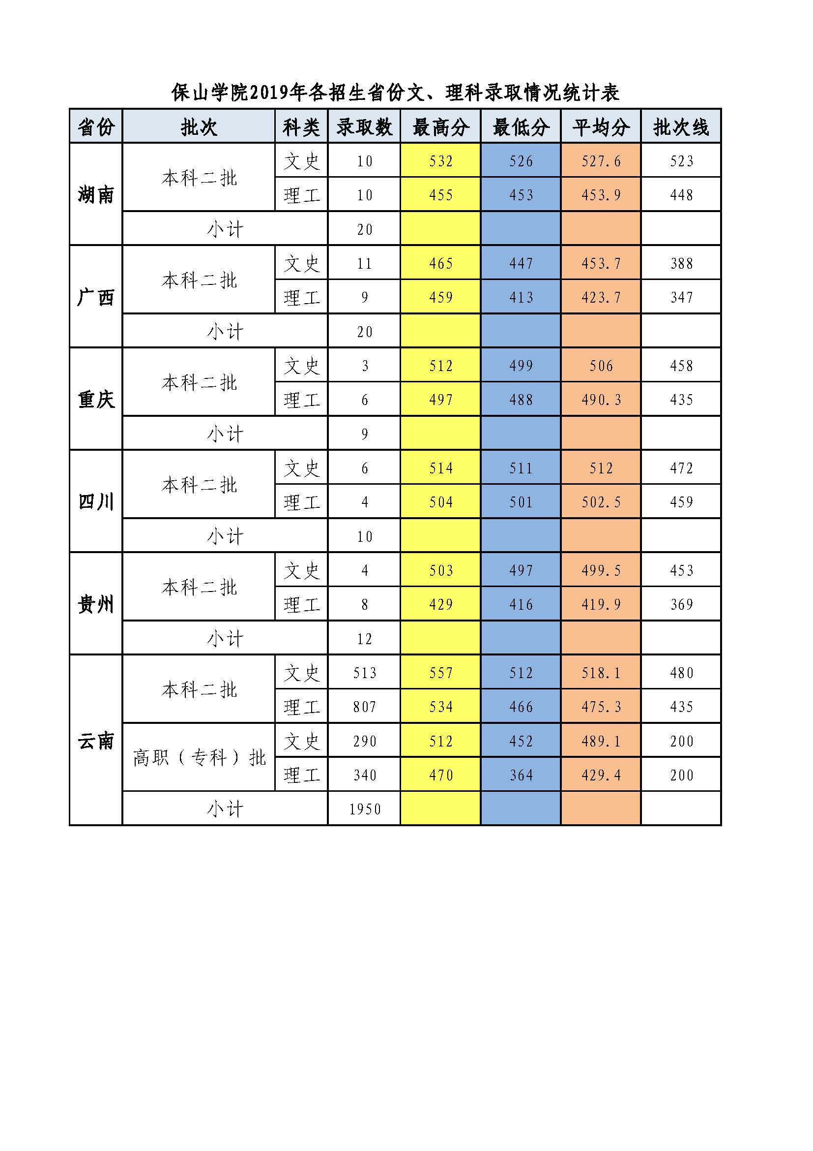 保山學(xué)院2019年各招生省份文、理科錄取情況統(tǒng)計(jì)表
