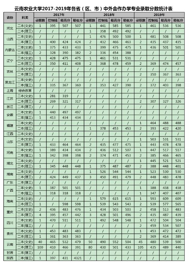 云南農(nóng)業(yè)大學(xué)2017-2019年各?。▍^(qū)、市)中外合作辦學(xué)類錄取分?jǐn)?shù)統(tǒng)計(jì)