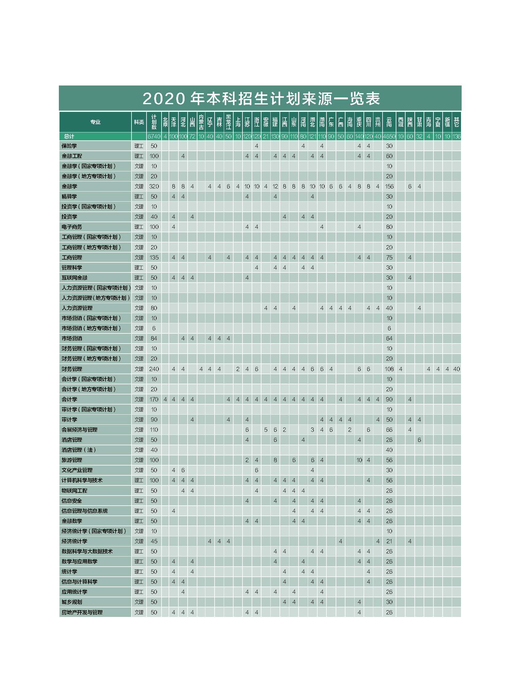 云南財經大學2020年本科招生計劃來源一覽表專業(yè)