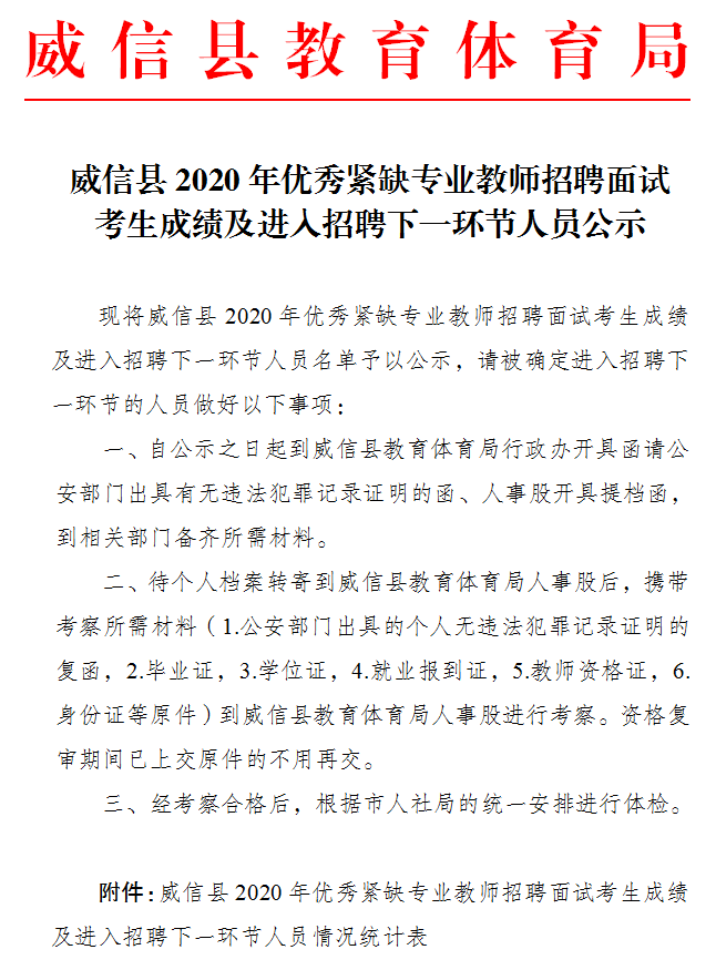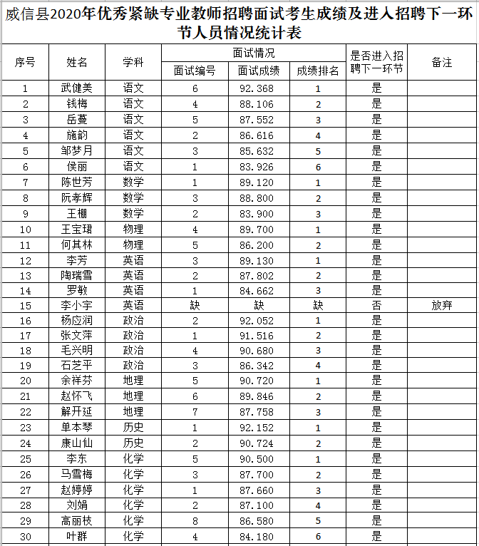 昭通市威信縣2020年優(yōu)秀緊缺專業(yè)教師招聘面試成績(jī)公示