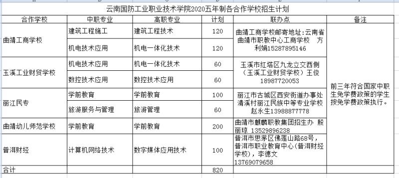 云南國防工業(yè)職業(yè)技術(shù)學(xué)院2020五年制各合作學(xué)校招生計(jì)劃