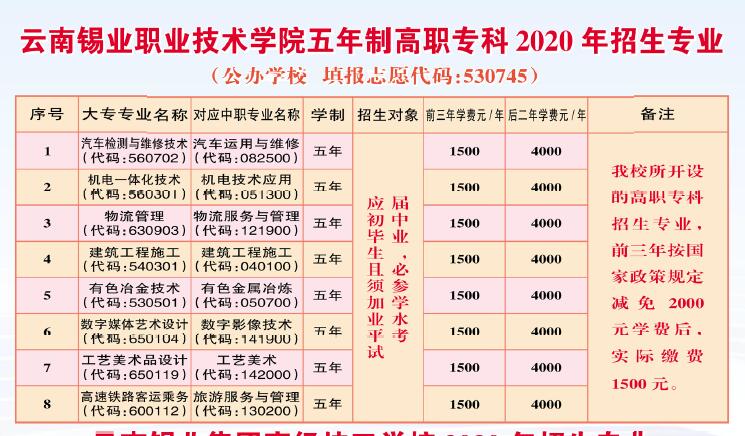 云南錫業(yè)職業(yè)技術(shù)學(xué)院五年制高職專(zhuān)科2020年招生簡(jiǎn)章