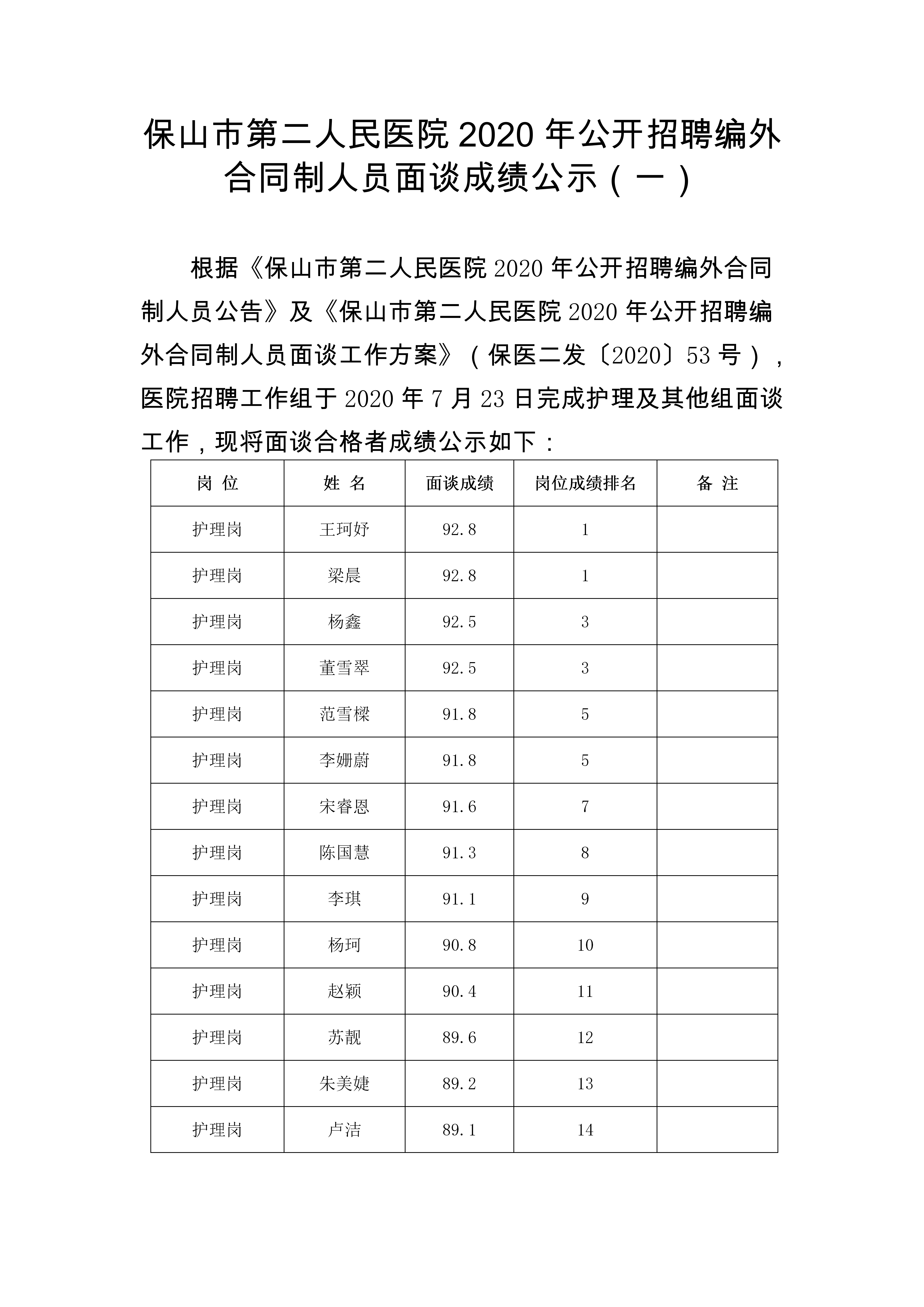 保山市第二人民醫(yī)院2020年招聘編外合同制人員面談成績公示(一)