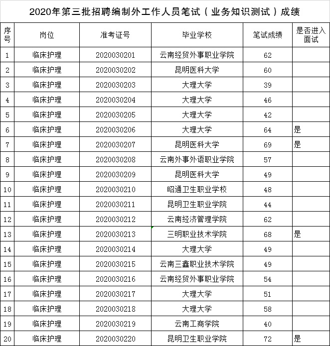 玉溪市元江縣中醫(yī)醫(yī)院2020年第三批招聘筆試(業(yè)務知識測試)成績
