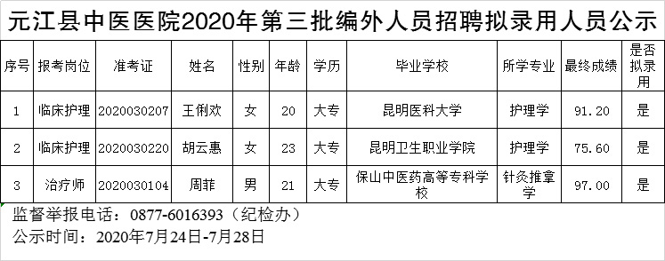 元江縣中醫(yī)醫(yī)院2020年第三批編外人員招聘擬錄用人員公示