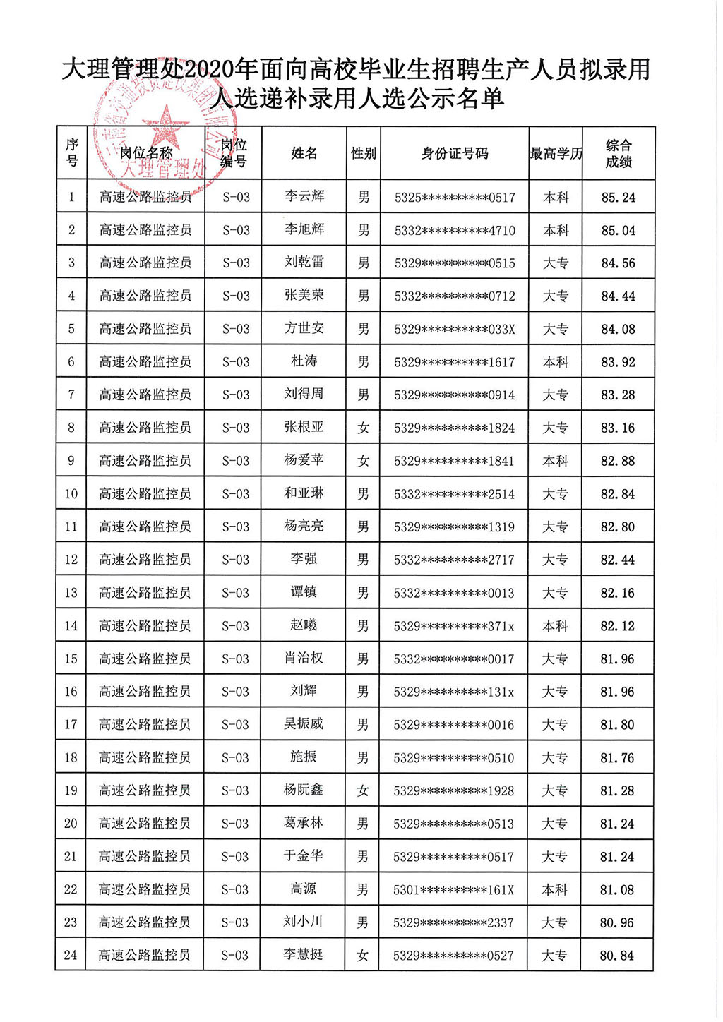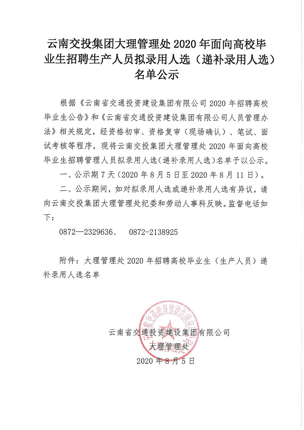 云南交投集團大理管理處2020年招聘擬錄用(遞補)名單公示