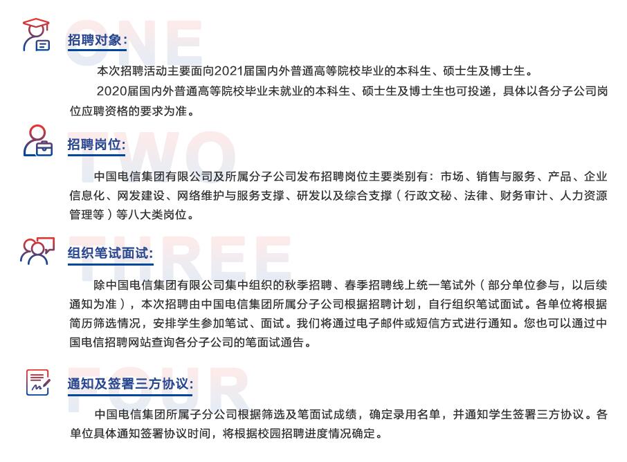 以上流程及信息若有變動(dòng),敬請(qǐng)關(guān)注中國電信集團(tuán)有限公司——“招賢納士”專欄(http://www.chinatelecom.com.cn/zp/)、前程無憂合作網(wǎng)站(http://campus.51job.com/chinatelecom2021)和中國電信校園招聘微信公眾號(hào)(搜索“中國電信校園招聘”或“中國電信校招速遞”),瀏覽最新的校招信息。