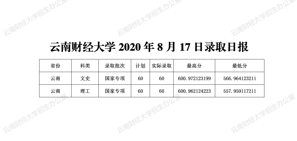云南財(cái)經(jīng)大學(xué)2020年8月17日錄取日?qǐng)?bào)