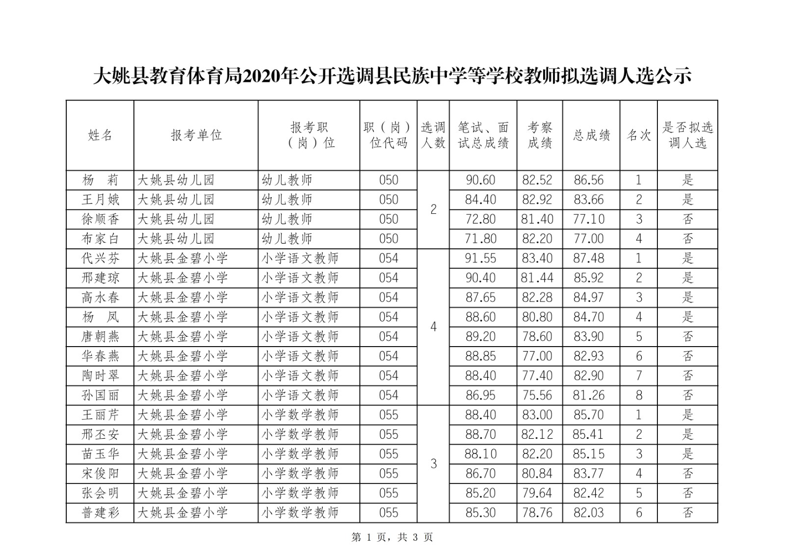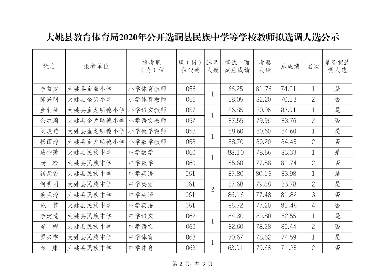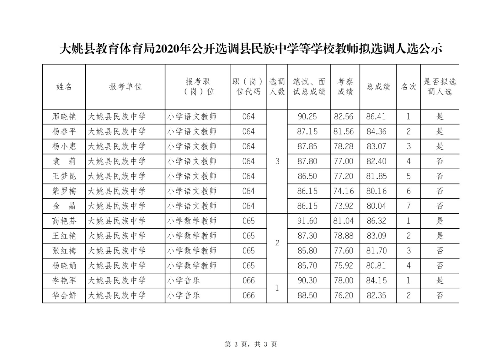 大姚縣教育體育局2020年公開選調縣民族中學等學校教師擬選調人選公示