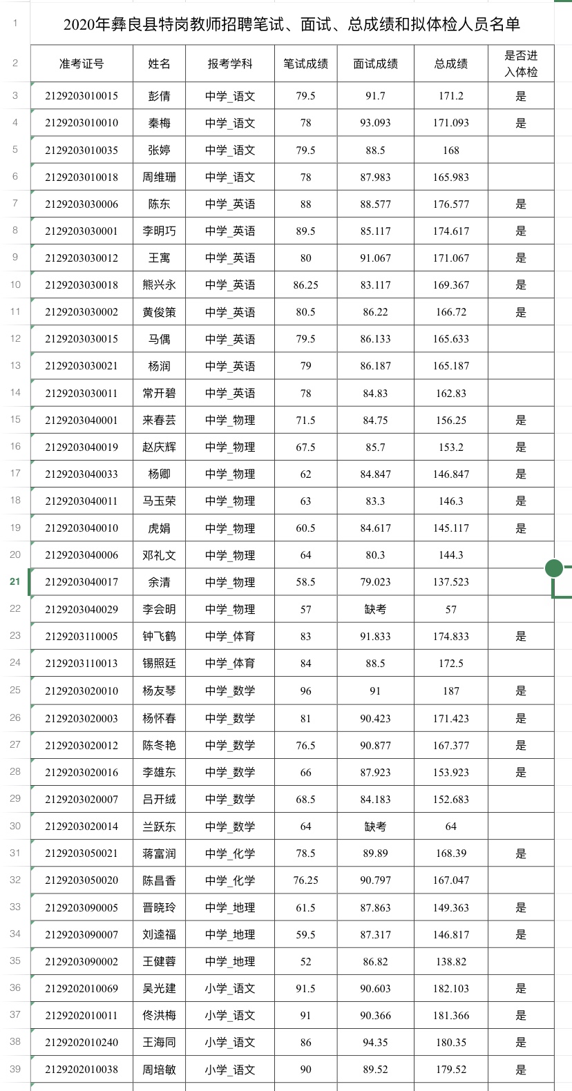 附件:2020年彝良縣特崗教師招聘筆試、面試、總成績和擬體檢人員名單.xls