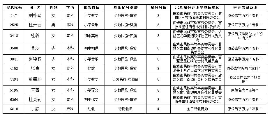 2020年8月13日由曲靖市人力資源和社會保障局公告的《陸良縣2020年公開招聘教師筆試成績政策性加分人員及分值公告》中的部分人員信息需予以更正,具體情況如下: