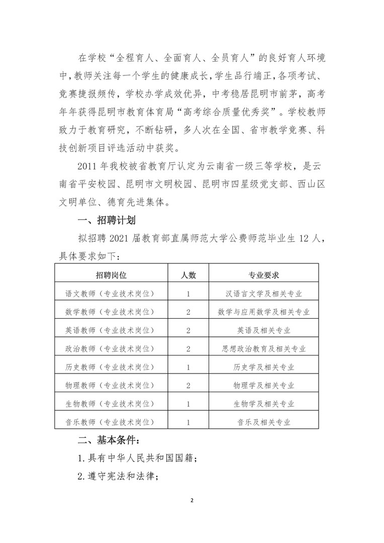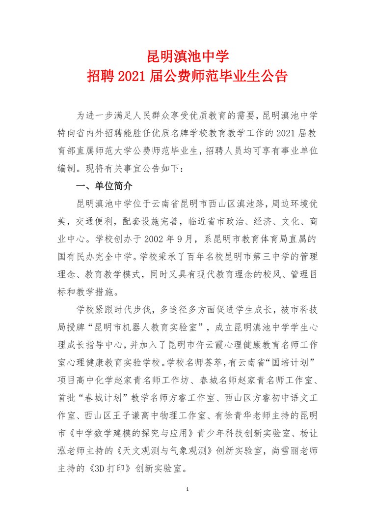 昆明滇池中學(xué)招聘2021屆公費(fèi)師范畢業(yè)生公告