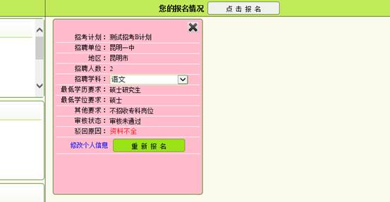 如果審核沒有通過(guò),需要查看駁回原因。此時(shí)可以根據(jù)駁回原因進(jìn)行修正,并選擇該計(jì)劃下的崗位進(jìn)行重新報(bào)名或者刪除該報(bào)名崗位,點(diǎn)擊“開始報(bào)名”,重新報(bào)名該計(jì)劃或者其他計(jì)劃。