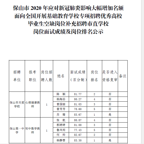 保山市2020年應(yīng)對新冠肺炎影響大幅增加名額面向全國開展 基礎(chǔ)教育學校專項招聘優(yōu)秀高校畢業(yè)生空缺崗位補充招聘市直學校崗位面試成績及崗位排名公示