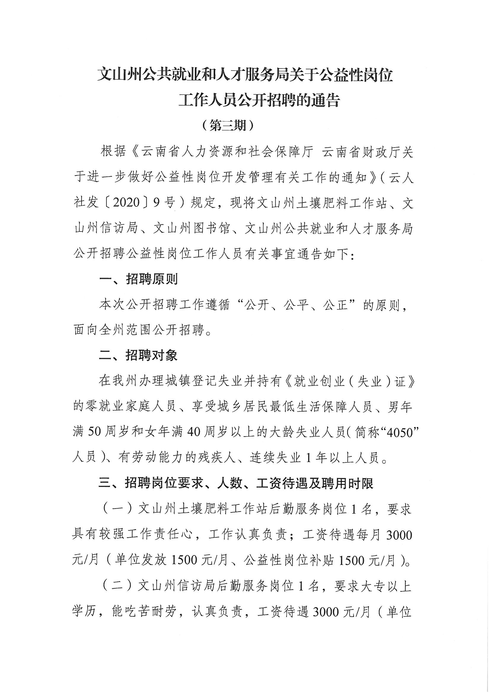 文山州公共就業(yè)和人才服務(wù)局關(guān)于公益性崗位工作人員公開招聘的通告(第三期)