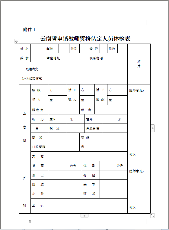 附件:1.云南省申請教師資格認(rèn)定人員體檢表