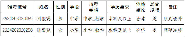 根據(jù)《文山州2020年特崗教師招聘公告》《麻栗坡縣2020年特崗教師招聘面試公告》《麻栗坡縣2020年特崗教師招聘綜合成績(jī)及擬聘人員體檢事項(xiàng)公告》《麻栗坡縣2020年特崗教師招聘擬聘特崗教師及選崗工作等調(diào)整相關(guān)事項(xiàng)公告》規(guī)定,因體檢不合格1人,自愿放棄擬聘資格1人,順延遞補(bǔ)2人?,F(xiàn)將順延遞補(bǔ)人員名單公告如下: