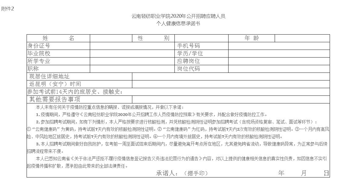 2.云南輕紡職業(yè)學院2020年公開招聘應聘人員個人健康信息承諾書