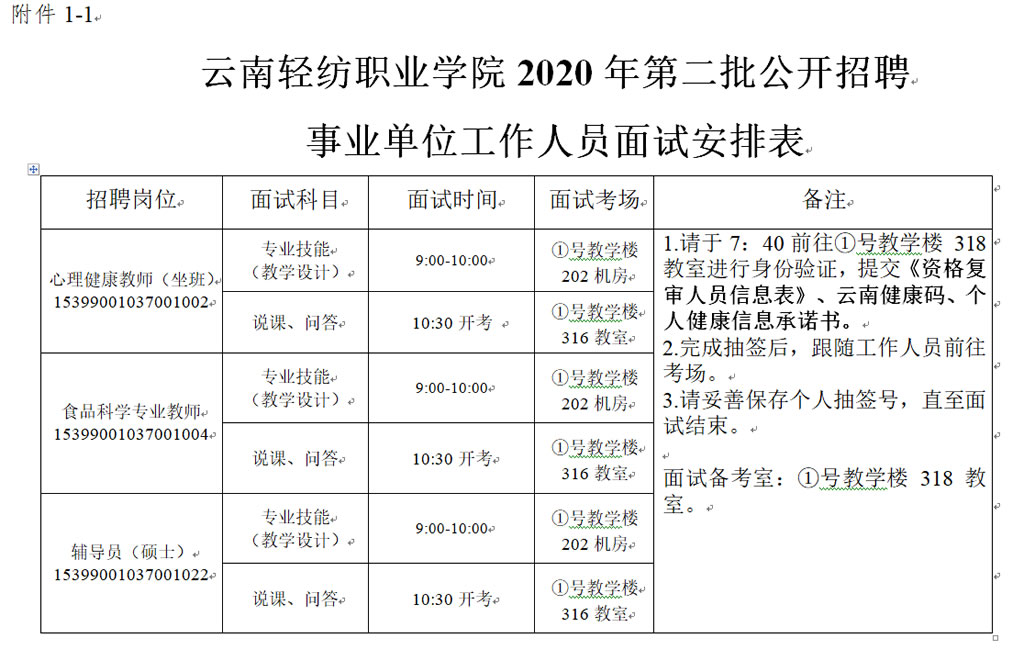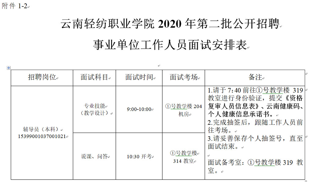 1.云南輕紡職業(yè)學院2020年第二批公開招聘事業(yè)單位工作人員面試安排表