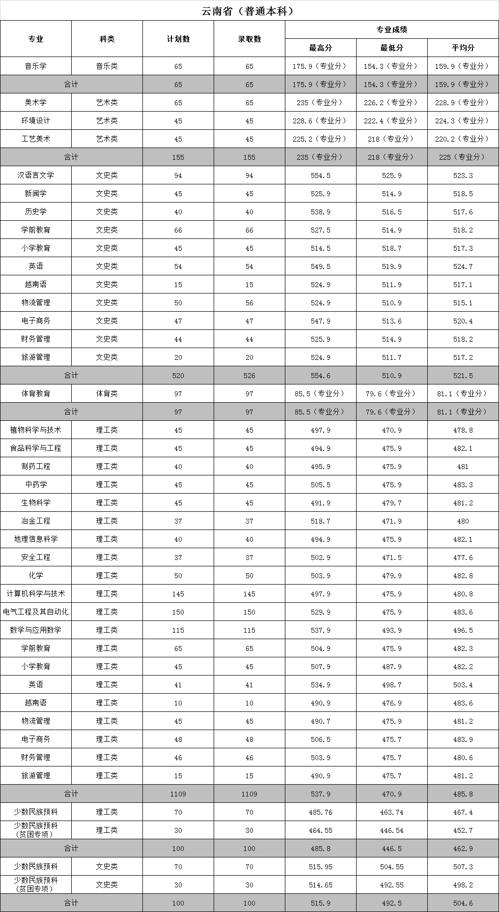 文山學(xué)院2020年招生錄取分?jǐn)?shù)統(tǒng)計(jì)一(云南省本科)