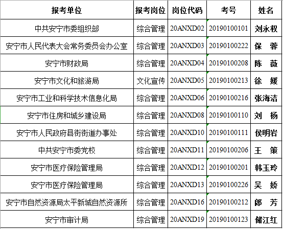 根據(jù)《云南省安寧市2020年市直單位(街道)面向市外公開選調(diào)公務員(參公管理人員)公告》,劉永權(quán)等12名同志通過公開報名、筆試、面試、資格復審、業(yè)績評價、體檢、考察程序,符合安寧市對外選調(diào)公務員的資格條件,現(xiàn)予以公示。