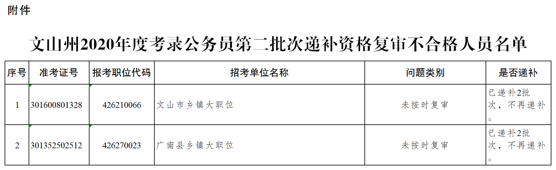 附件:文山州2020年度考錄公務(wù)員第二批次遞補(bǔ)資格復(fù)審不合格人員名單