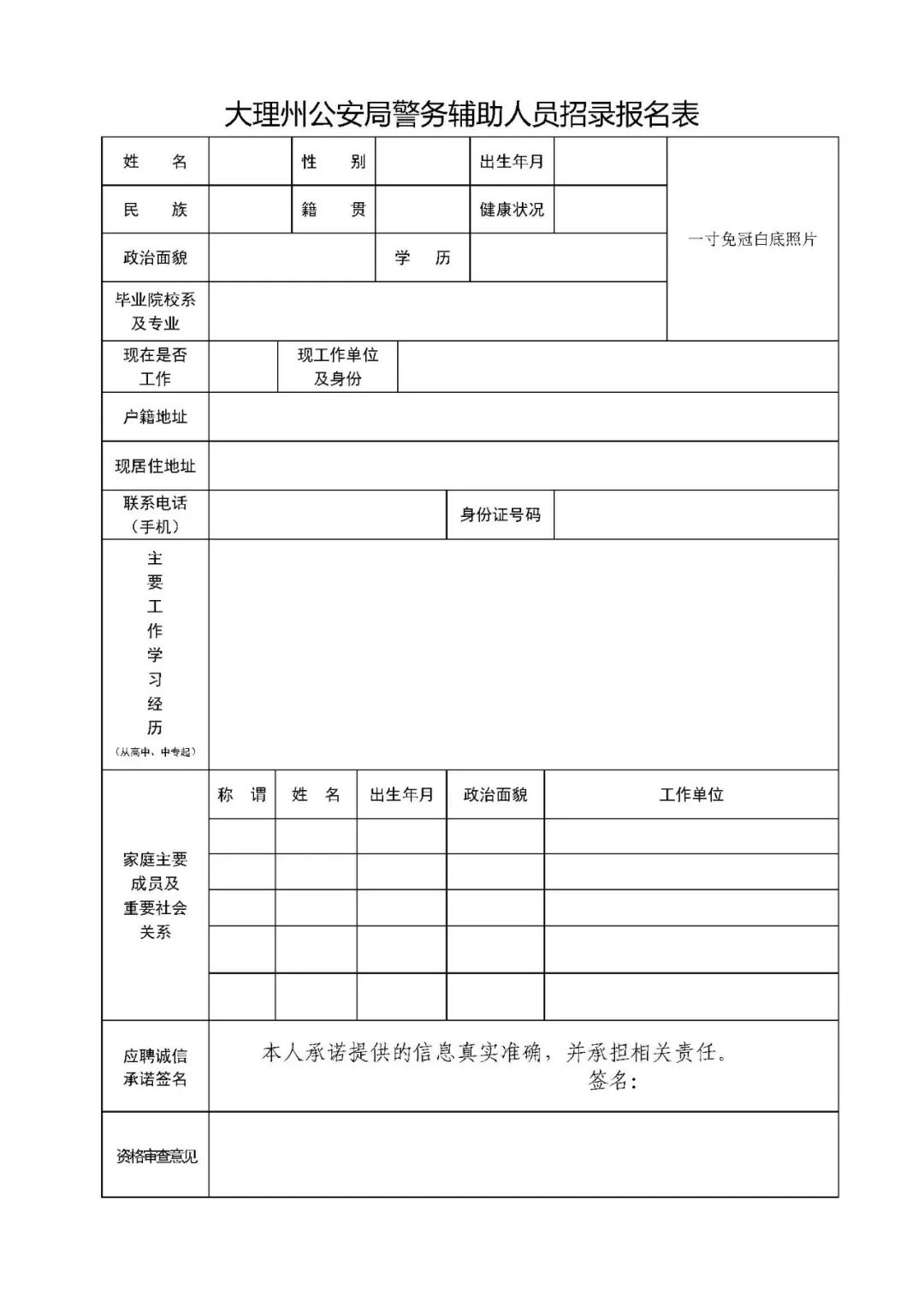 報(bào)名方式:本次招聘采取本人現(xiàn)場(chǎng)報(bào)名形式開展,不接受他人代報(bào),應(yīng)聘人員報(bào)名前應(yīng)仔細(xì)閱讀招聘公告,真實(shí)填報(bào)《大理州公安局警務(wù)輔助人員招錄報(bào)名表》(自行下載保存圖片,打印后手寫填報(bào))。